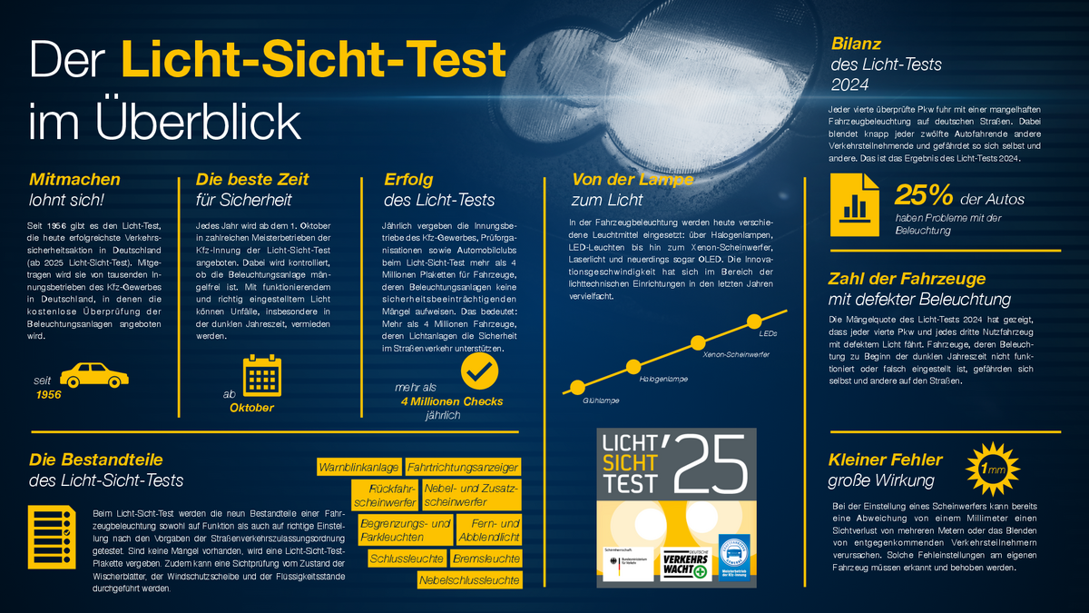 Bitte informieren Sie Ihre Betriebe über die neuen Licht-Sicht-Test-Angebote. Der Licht-Sicht-Test soll auch in diesem Jahr wieder eine erfolgreiche Aktion werden, die Kunden und Kfz-Meisterbetrieben einen Mehrwert bringt. Mitmachen lohnt sich!