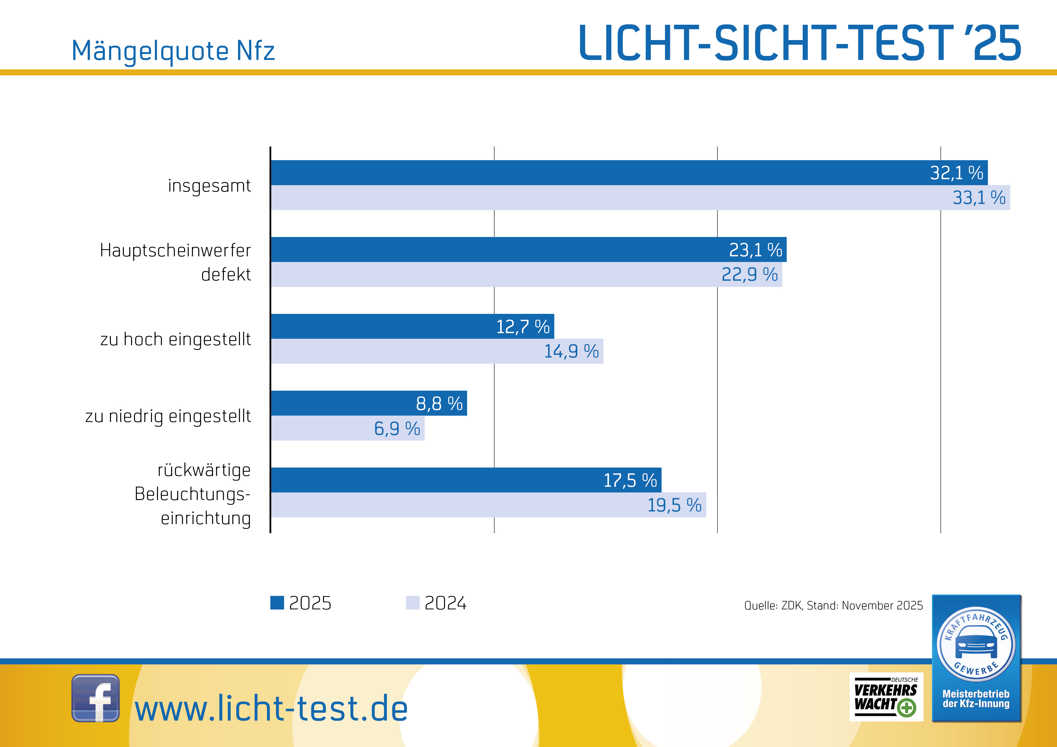 Beim Licht-Sicht-Test 2025 hatte mehr als jeder vierte Pkw (27,8 %) Mängel an der Beleuchtung (Vorjahr 25,3 %). Bei den Nutzfahrzeugen waren es 32,1 % (Vorjahr 33,1 %). Das ergibt die aktuelle Statistik des Zentralverbands Deutsches Kraftfahrzeuggewerbe (ZDK) und der Deutschen Verkehrswacht (DVW).