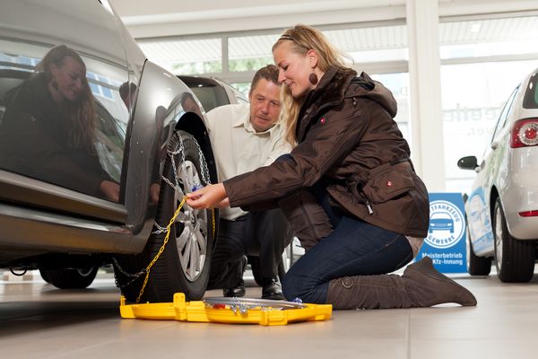 Schneeketten müssen zum Auto und zu den Winterreifen passen. Entscheidende Maße sind Reifenbreite, Höhe-Breite-Verhältnis und Felgendurchmesser. Aufschluss darüber geben die Größenangabe auf der Reifenflanke (Beispiel: 175/65 R14) sowie die Daten im Fahrzeugschein unter Punkt 15.1 und 15.2.