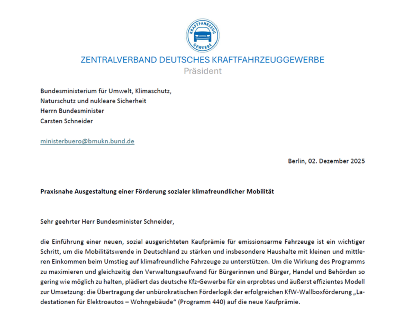 Der ZDK hat den zuständigen Ministerien einen Vorschlag zur Ausgestaltung der angekündigten Kaufprämie für „klimafreundliche soziale Mobilität" vorgelegt. Der ZDK plädiert dafür, Anträge – analog zur 2023 ausgelaufenen KfW-Wallbox-Förderung – bereits vor dem Fahrzeugkauf prüfen und genehmigen zu lassen, um das Förderverfahren bürokratiearm und händlerfreundlichzu gestalten.