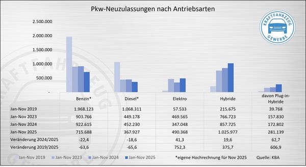 Rein statistisch präsentiert sich der Elektroantrieb in diesem Jahr mit starkem Aufwind: Im November stiegen die Neuzulassungen vollelektrischer Pkw (BEV) laut KBA auf 55.741 Fahrzeuge – ein kräftiges Plus von 58,5 Prozent gegenüber dem Vorjahresmonat und damit der stärkste Monatsanstieg des Jahres 2025 sowie der zweithöchste Wert an BEV-Zulassungen in den letzten drei Jahren. Auch teilelektrische Modelle legten deutlich zu: Die Hybridzulassungen kletterten um 9,3 Prozent auf 103.349 Einheiten, Plug-in-Hybride (PHEV) sogar um 57,4 Prozent auf 32.433 Fahrzeuge.